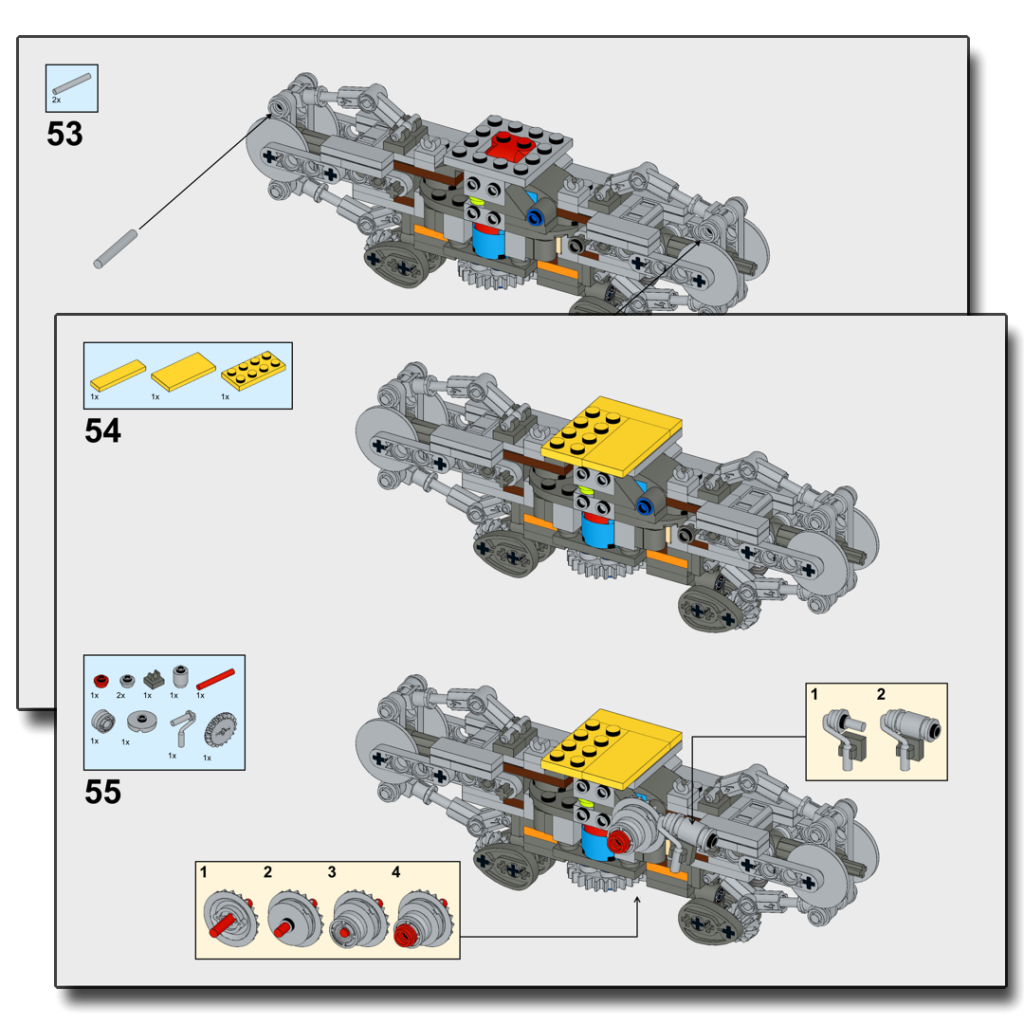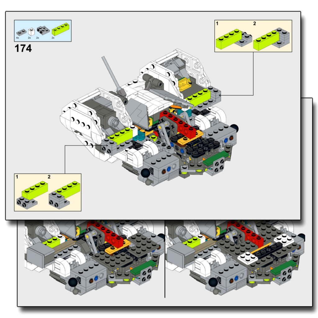 There is a bug in the parts list for the 1.2 version currently. I plan to fix this in the instructions when I have time, but until then, the following parts need to be added to the parts list: “2 reddish brown 2×2 plate,” “2 light bluish grey 2×3 plate.” (Thanks to Jason Kearney for reporting this issue!)